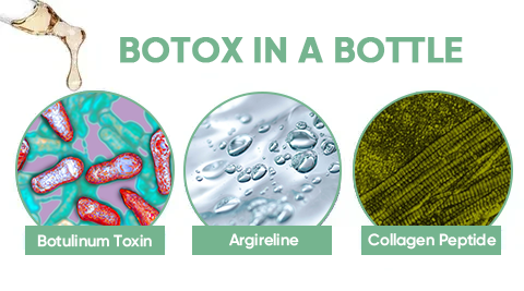 Infused with Botulinum toxin, a substance used in botox injections, this concentrated serum effectively Downplaying facial fine lines and wrinkles. Botulinum toxin in cosmetic form reduces and fades forehead creases, frown lines, and crow's feet near the eyes.